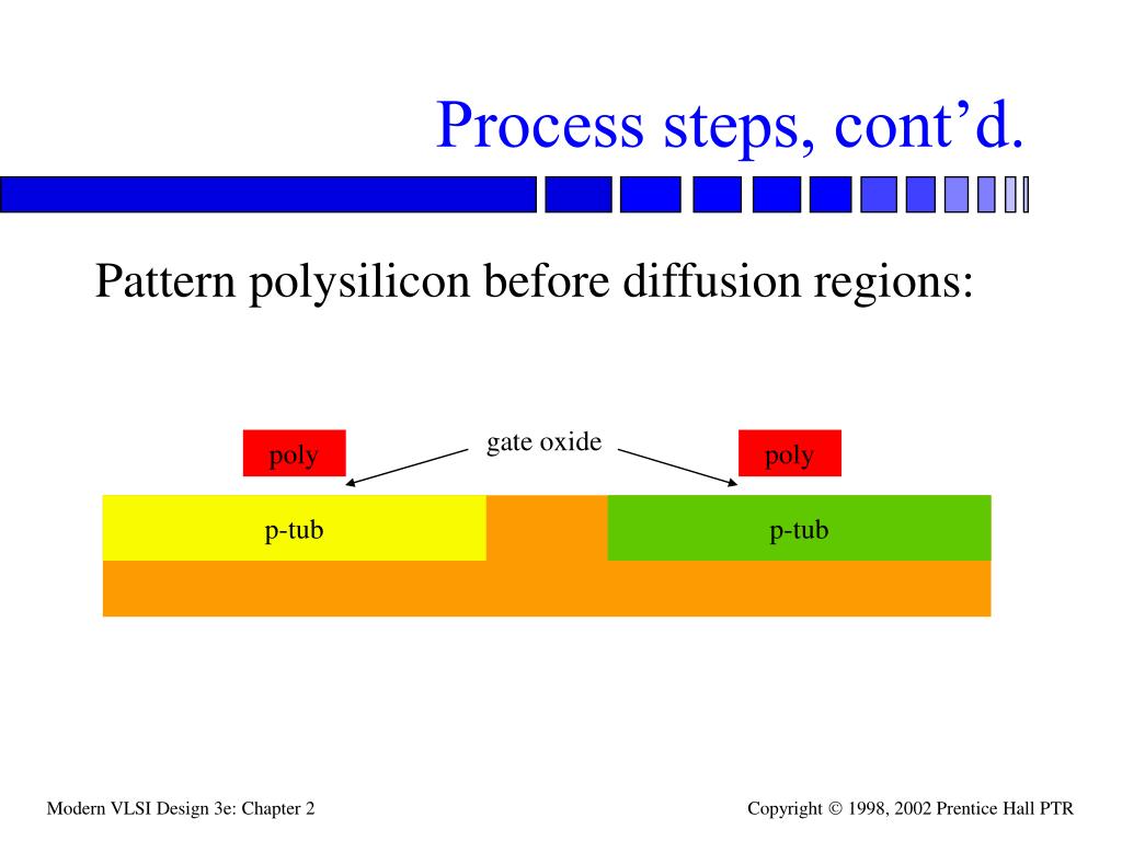 Process steps, cont’d. Pattern polysilicon before diffusion regions: gate oxide poly poly p-tub p-tub