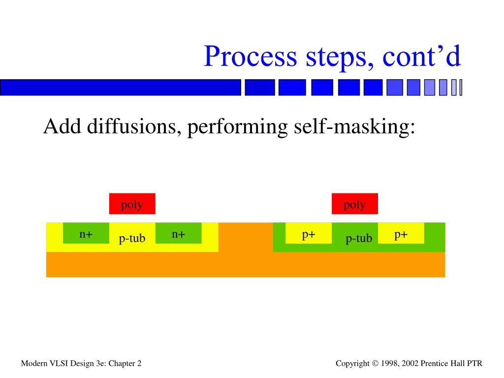 Process steps, cont’d Add diffusions, performing self-masking: poly poly p-tub n+ n+ p-tub p+ p+