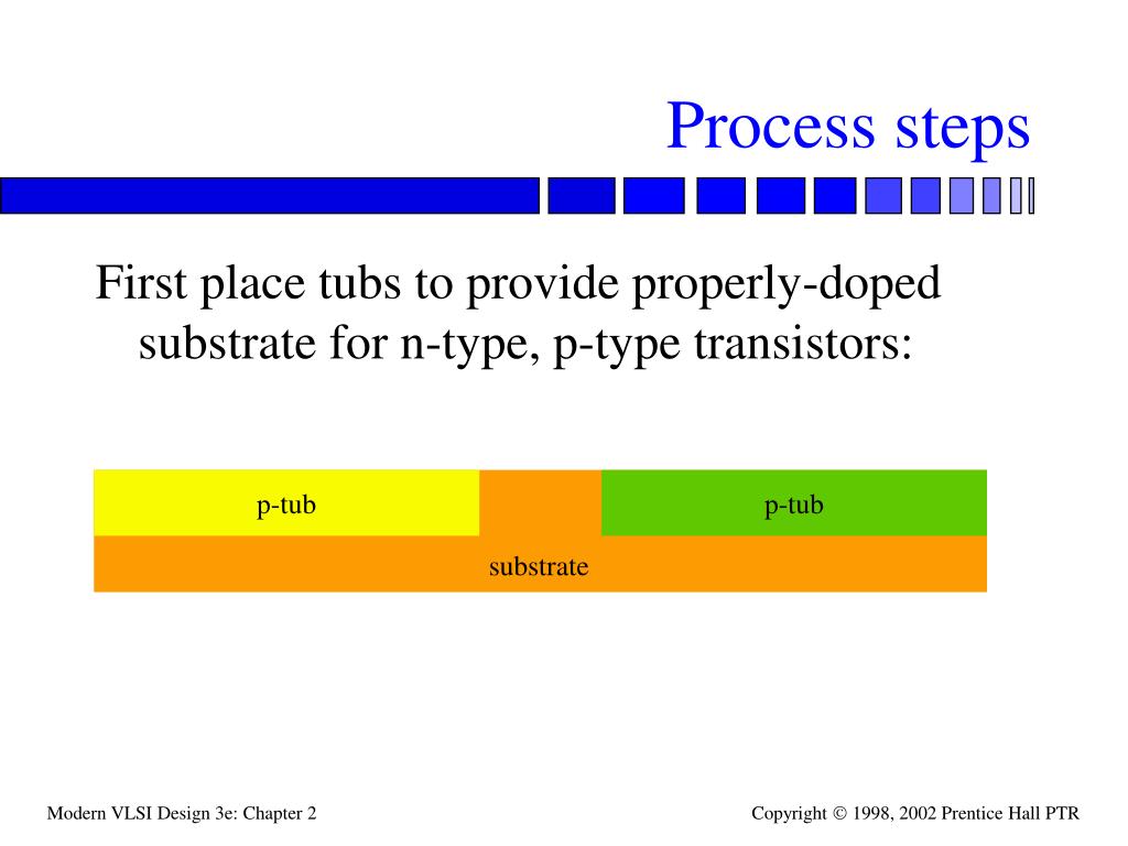 Process steps First place tubs to provide properly-doped substrate for n-type, p-type transistors: p-tub p-tub substrate