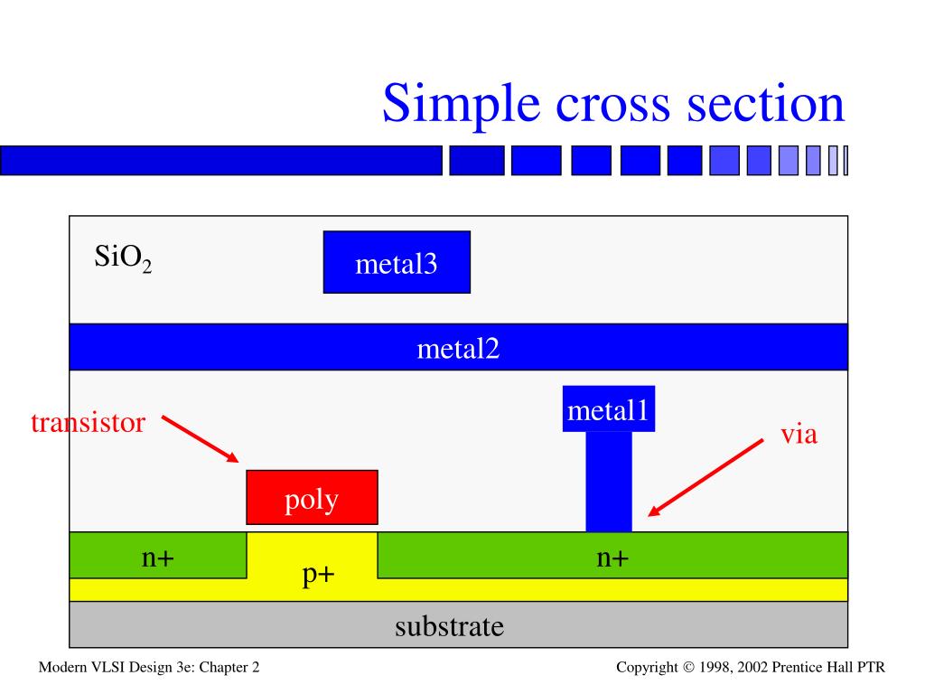 transistor via Simple cross section SiO2 metal3 metal2 metal1 poly substrate n+ n+ p+ substrate
