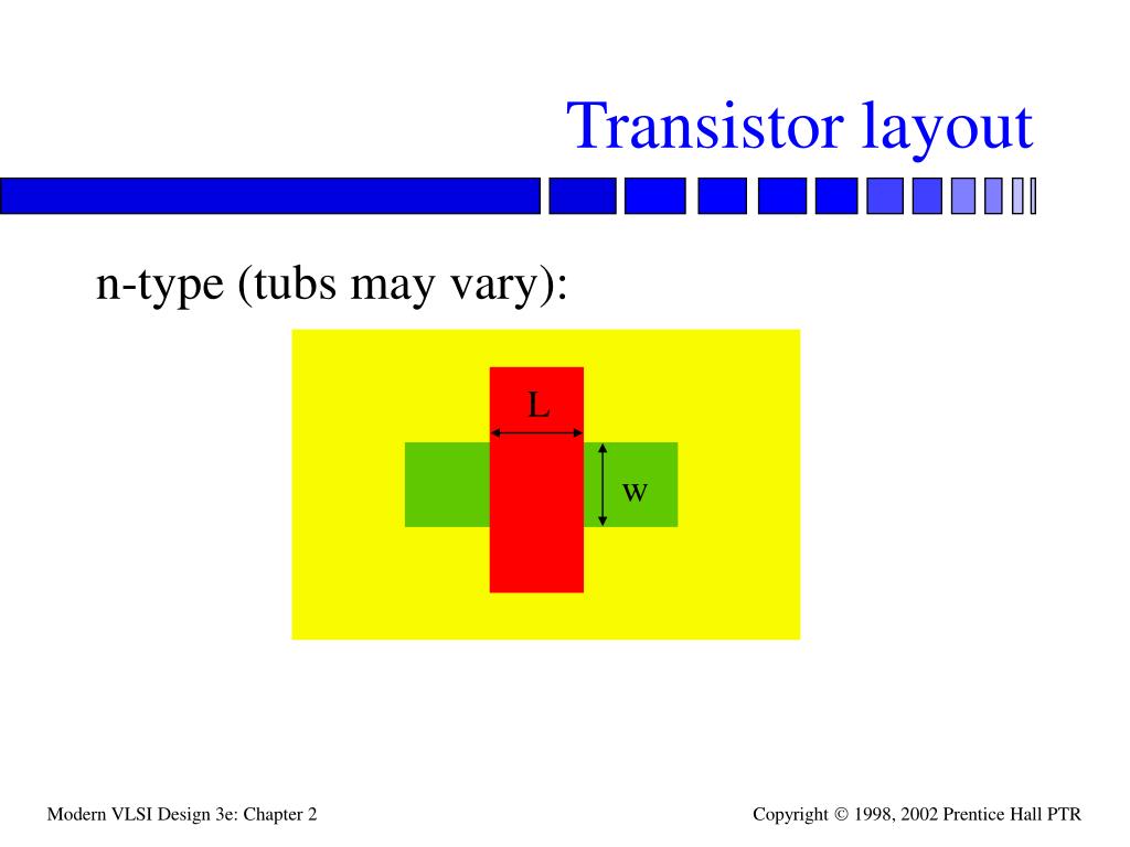 Basic transistor parasitics, cont’d • Gate capacitance Cg. Determined by active area. • Source/drain overlap capacitances Cgs, Cgd. Determined by source/gate and drain/gate overlaps. Independent of transistor L. • Cgs = Col W • Gate/bulk overlap capacitance.