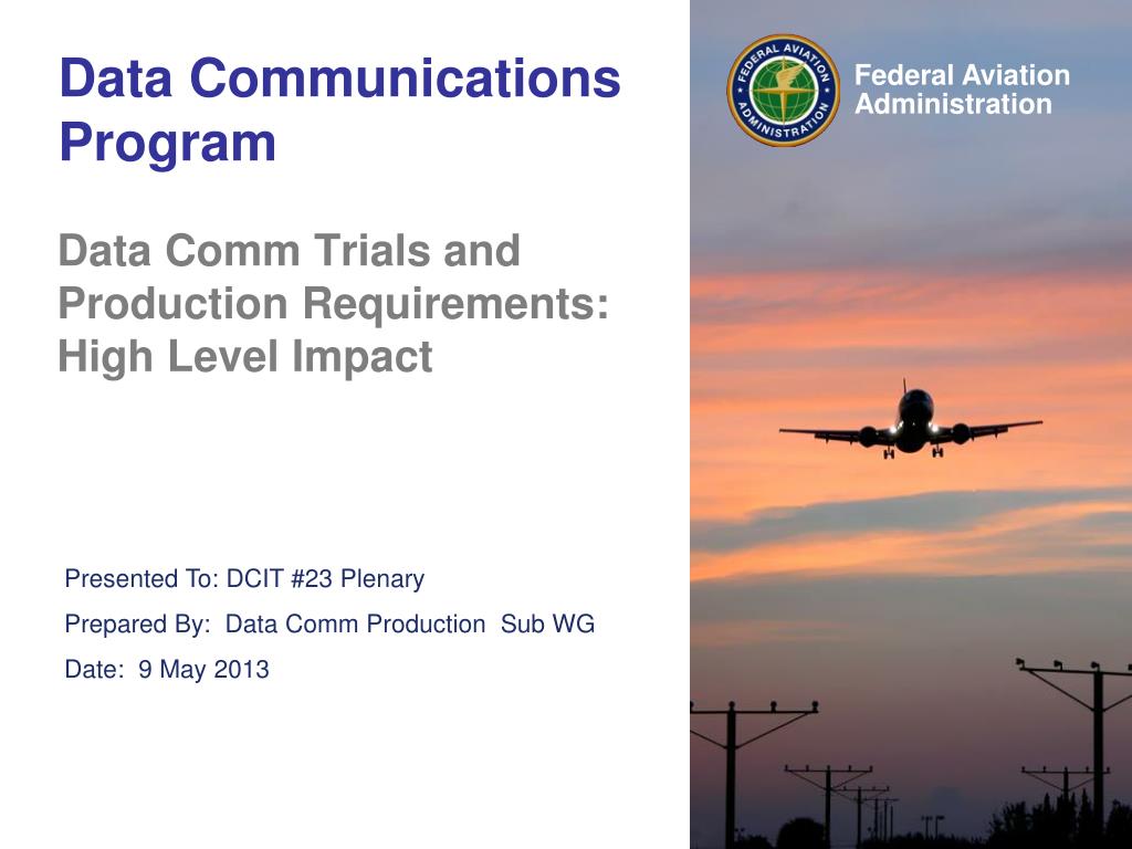 Data Communications Program Data Comm Trials and Production Requirements: High Level Impact Presented To: DCIT #23 Plenary Prepared By: Data Comm Production Sub WG Date: 9 May 2013