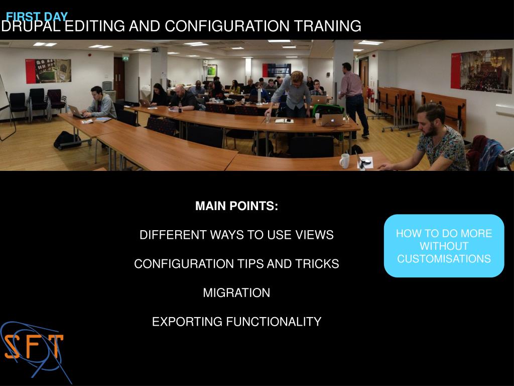 FIRST DAY DRUPAL EDITING AND CONFIGURATION TRANING MAIN POINTS: DIFFERENT WAYS TO USE VIEWS CONFIGURATION TIPS AND TRICKS MIGRATION EXPORTING FUNCTIONALITY HOW TO DO MORE WITHOUT CUSTOMISATIONS