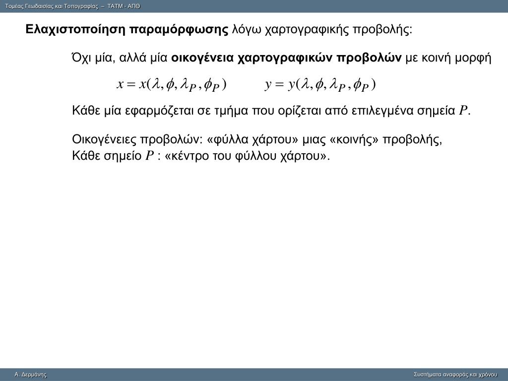 Ελαχιστοποίηση παραμόρφωσης λόγω χαρτογραφικής προβολής: Όχι μία, αλλά μία οικογένεια χαρτογραφικών προβολών με κοινή μορφή Kάθε μία εφαρμόζεται σε τμήμα που ορίζεται από επιλεγμένα σημεία P. Οικογένειες προβολών: «φύλλα χάρτου» μιας «κοινής» προβολής, Kάθε σημείο P: «κέντρο του φύλλου χάρτου». Oι συντεταγμένες x, y μιας χαρτογραφικής προβολής εξαρτώνται από (α) το είδος της προβολής, δηλαδή από τις μαθηματικές σχέσεις x = x(λ,), y = y(λ,), (β) το χρησιμοποιούμενο γεωδαιτικό datum στο οποίο εφαρμόζεται η προβολή.