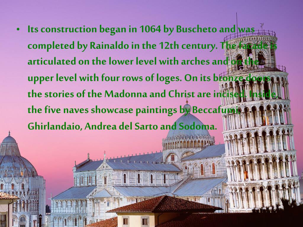 Its construction began in 1064 by Buscheto and was completed by Rainaldo in the 12th century. The facade is articulated on the lower level with arches and on the upper level with four rows of loges. On its bronze doors the stories of the Madonna and Christ are incised. Inside, the five naves showcase paintings by Beccafumi, Ghirlandaio, Andrea del Sarto and Sodoma.