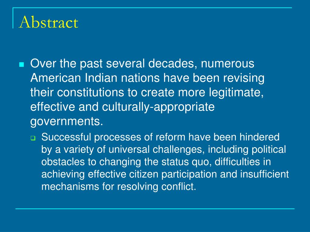 Abstract • Over the past several decades, numerous American Indian nations have been revising their constitutions to create more legitimate, effective and culturally-appropriate governments. • Successful processes of reform have been hindered by a variety of universal challenges, including political obstacles to changing the status quo, difficulties in achieving effective citizen participation and insufficient mechanisms for resolving conflict.