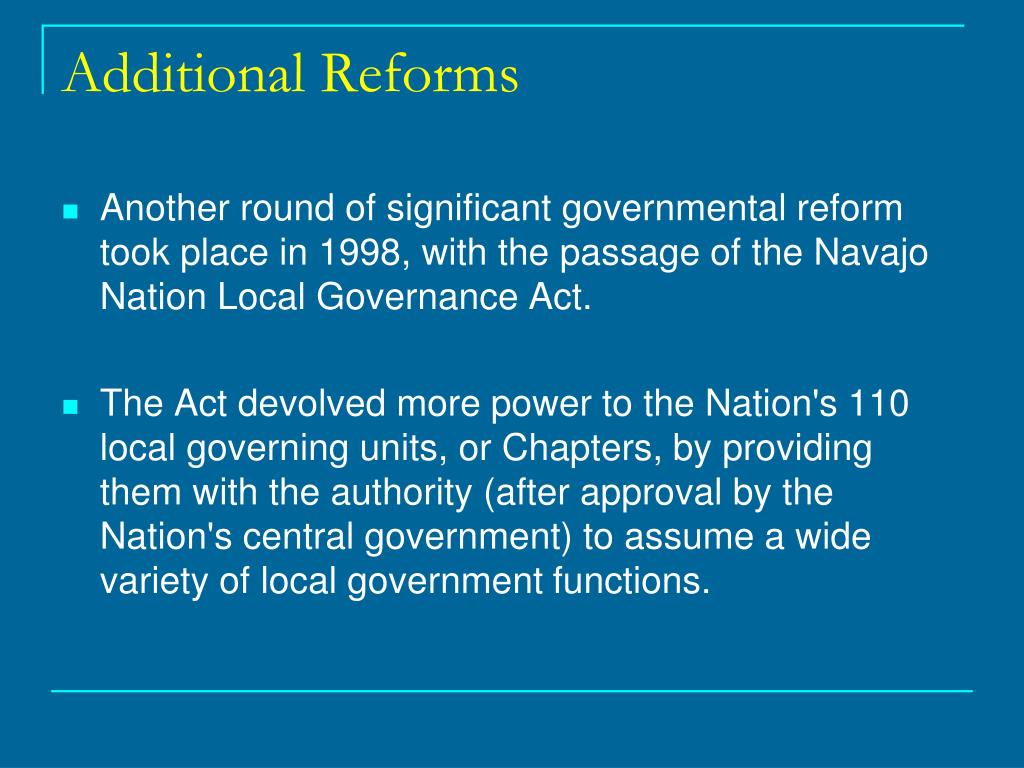 Additional Reforms • Another round of significant governmental reform took place in 1998, with the passage of the Navajo Nation Local Governance Act. • The Act devolved more power to the Nation's 110 local governing units, or Chapters, by providing them with the authority (after approval by the Nation's central government) to assume a wide variety of local government functions.