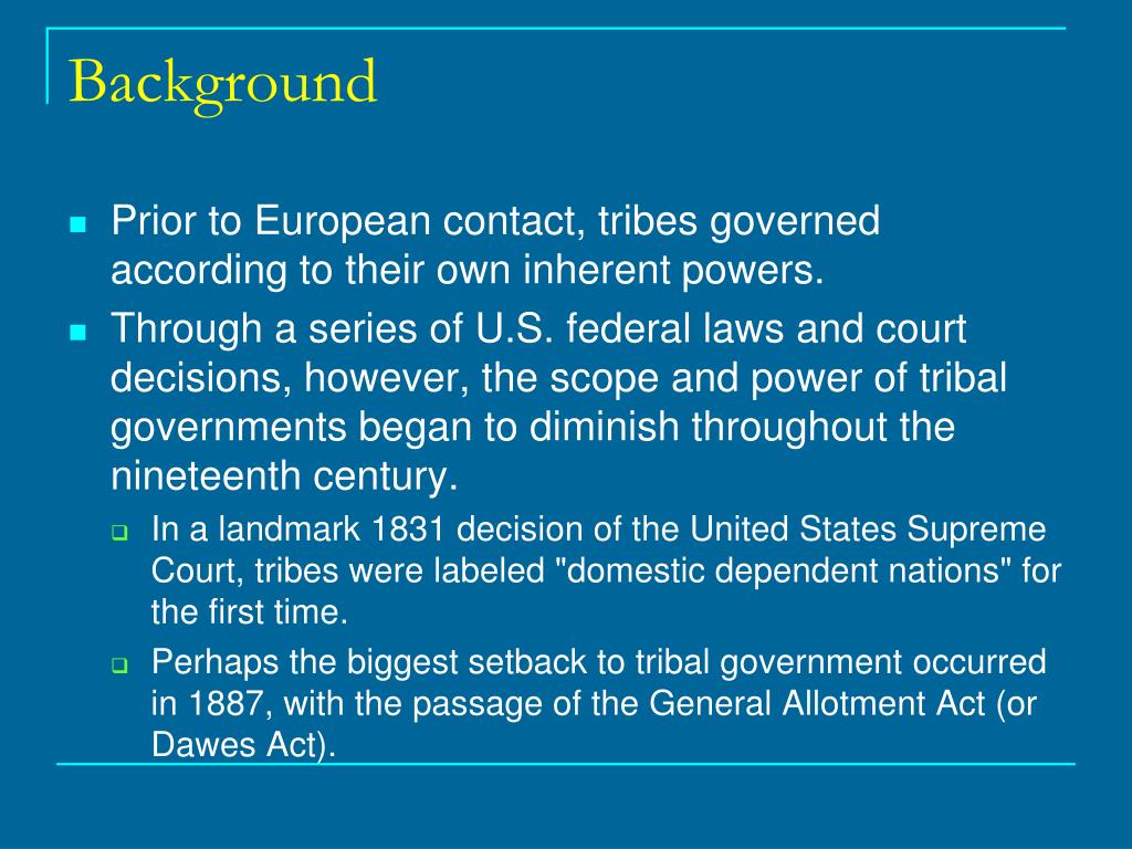 Background • Prior to European contact, tribes governed according to their own inherent powers. • Through a series of U.S. federal laws and court decisions, however, the scope and power of tribal governments began to diminish throughout the nineteenth century. • In a landmark 1831 decision of the United States Supreme Court, tribes were labeled "domestic dependent nations" for the first time. • Perhaps the biggest setback to tribal government occurred in 1887, with the passage of the General Allotment Act (or Dawes Act).