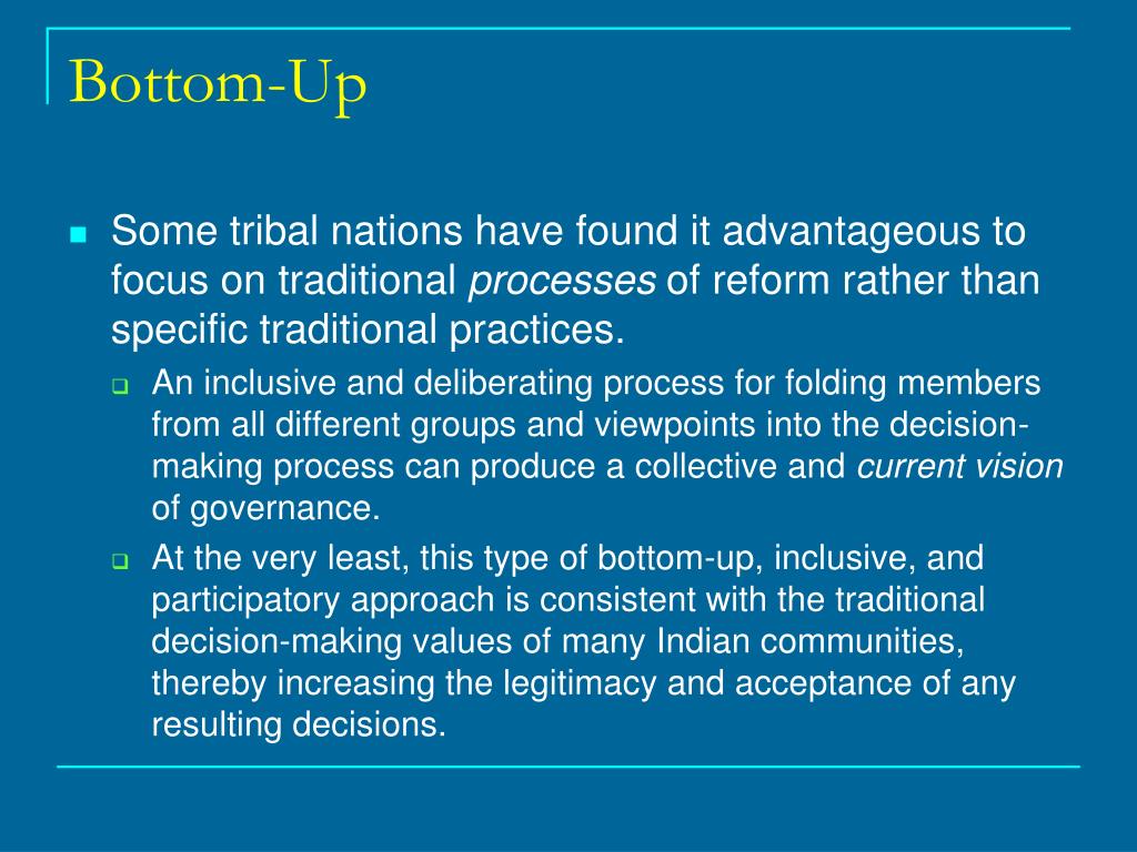 Bottom-Up • Some tribal nations have found it advantageous to focus on traditional processes of reform rather than specific traditional practices. • An inclusive and deliberating process for folding members from all different groups and viewpoints into the decision-making process can produce a collective and current vision of governance. • At the very least, this type of bottom-up, inclusive, and participatory approach is consistent with the traditional decision-making values of many Indian communities, thereby increasing the legitimacy and acceptance of any resulting decisions.