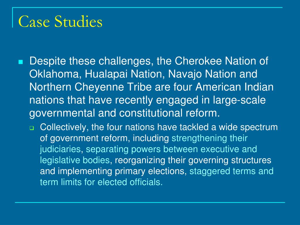Case Studies • Despite these challenges, the Cherokee Nation of Oklahoma, Hualapai Nation, Navajo Nation and Northern Cheyenne Tribe are four American Indian nations that have recently engaged in large-scale governmental and constitutional reform. • Collectively, the four nations have tackled a wide spectrum of government reform, including strengthening their judiciaries, separating powers between executive and legislative bodies, reorganizing their governing structures and implementing primary elections, staggered terms and term limits for elected officials.