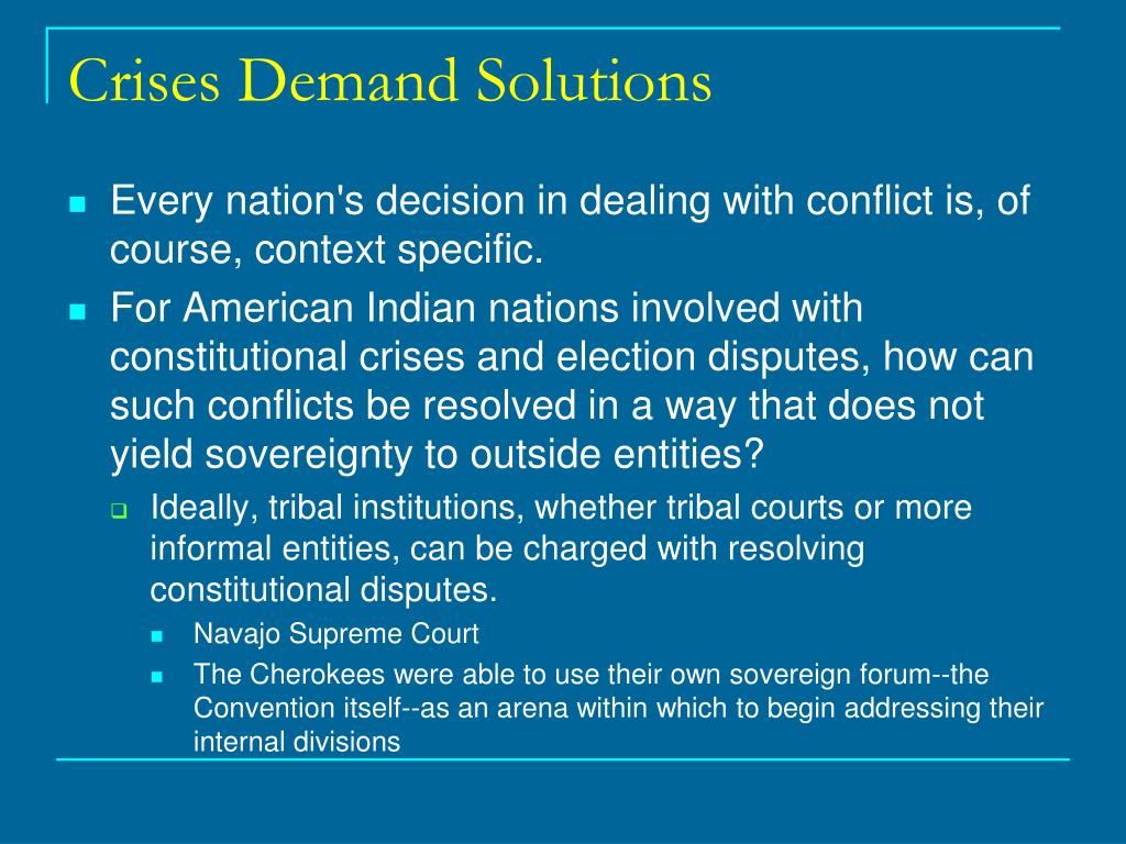 Crises Demand Solutions • Every nation's decision in dealing with conflict is, of course, context specific. • For American Indian nations involved with constitutional crises and election disputes, how can such conflicts be resolved in a way that does not yield sovereignty to outside entities? • Ideally, tribal institutions, whether tribal courts or more informal entities, can be charged with resolving constitutional disputes. • Navajo Supreme Court • The Cherokees were able to use their own sovereign forum--the Convention itself--as an arena within which to begin addressing their internal divisions