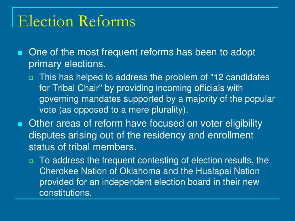 Election Reforms • One of the most frequent reforms has been to adopt primary elections. • This has helped to address the problem of "12 candidates for Tribal Chair" by providing incoming officials with governing mandates supported by a majority of the popular vote (as opposed to a mere plurality). • Other areas of reform have focused on voter eligibility disputes arising out of the residency and enrollment status of tribal members. • To address the frequent contesting of election results, the Cherokee Nation of Oklahoma and the Hualapai Nation provided for an independent election board in their new constitutions.