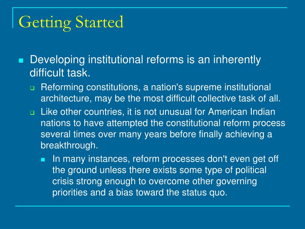 Getting Started • Developing institutional reforms is an inherently difficult task. • Reforming constitutions, a nation's supreme institutional architecture, may be the most difficult collective task of all. • Like other countries, it is not unusual for American Indian nations to have attempted the constitutional reform process several times over many years before finally achieving a breakthrough. • In many instances, reform processes don't even get off the ground unless there exists some type of political crisis strong enough to overcome other governing priorities and a bias toward the status quo.