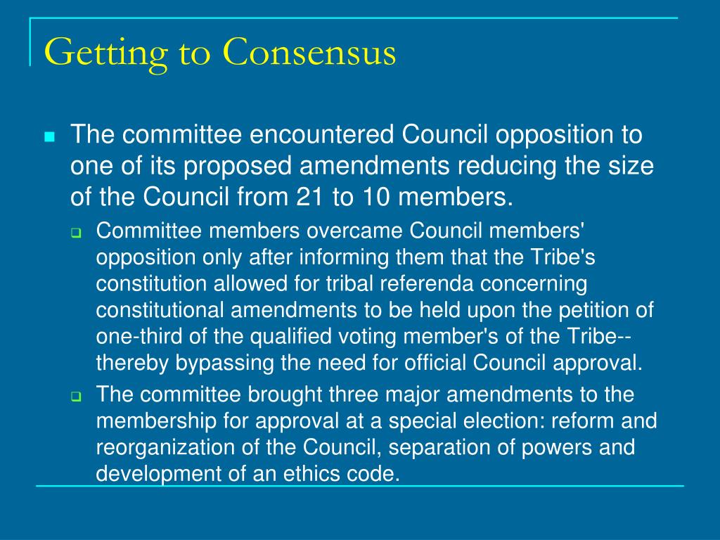 Getting to Consensus • The committee encountered Council opposition to one of its proposed amendments reducing the size of the Council from 21 to 10 members. • Committee members overcame Council members' opposition only after informing them that the Tribe's constitution allowed for tribal referenda concerning constitutional amendments to be held upon the petition of one-third of the qualified voting member's of the Tribe-- thereby bypassing the need for official Council approval. • The committee brought three major amendments to the membership for approval at a special election: reform and reorganization of the Council, separation of powers and development of an ethics code.