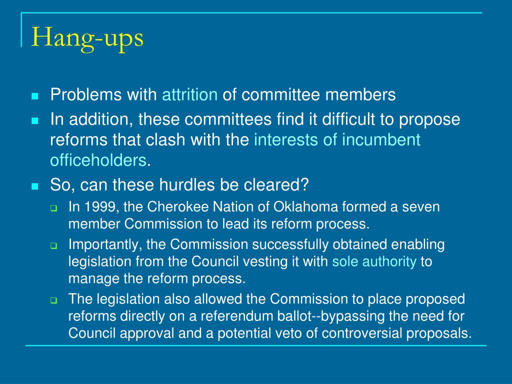 Hang-ups • Problems with attrition of committee members • In addition, these committees find it difficult to propose reforms that clash with the interests of incumbent officeholders. • So, can these hurdles be cleared? • In 1999, the Cherokee Nation of Oklahoma formed a seven member Commission to lead its reform process. • Importantly, the Commission successfully obtained enabling legislation from the Council vesting it with sole authority to manage the reform process. • The legislation also allowed the Commission to place proposed reforms directly on a referendum ballot--bypassing the need for Council approval and a potential veto of controversial proposals.