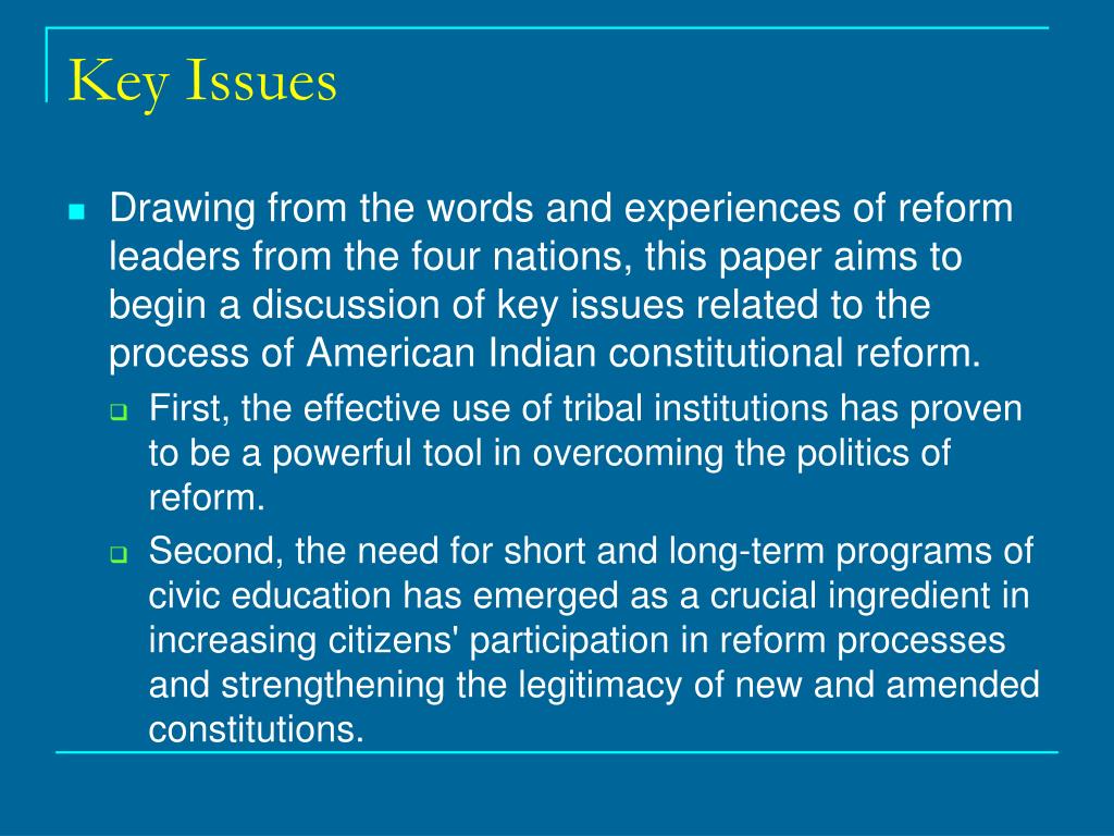 Key Issues • Drawing from the words and experiences of reform leaders from the four nations, this paper aims to begin a discussion of key issues related to the process of American Indian constitutional reform. • First, the effective use of tribal institutions has proven to be a powerful tool in overcoming the politics of reform. • Second, the need for short and long-term programs of civic education has emerged as a crucial ingredient in increasing citizens' participation in reform processes and strengthening the legitimacy of new and amended constitutions.