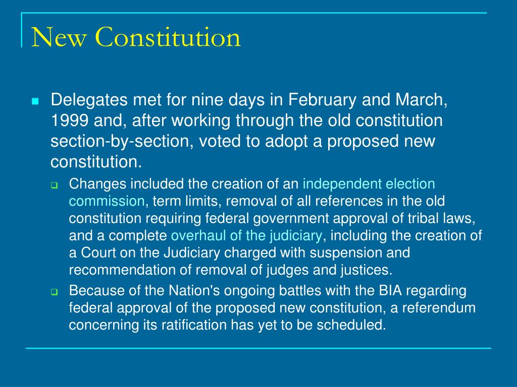New Constitution • Delegates met for nine days in February and March, 1999 and, after working through the old constitution section-by-section, voted to adopt a proposed new constitution. • Changes included the creation of an independent election commission, term limits, removal of all references in the old constitution requiring federal government approval of tribal laws, and a complete overhaul of the judiciary, including the creation of a Court on the Judiciary charged with suspension and recommendation of removal of judges and justices. • Because of the Nation's ongoing battles with the BIA regarding federal approval of the proposed new constitution, a referendum concerning its ratification has yet to be scheduled.