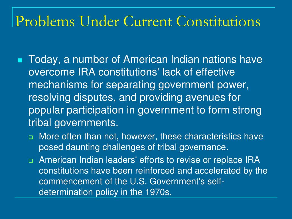 Problems Under Current Constitutions • Today, a number of American Indian nations have overcome IRA constitutions' lack of effective mechanisms for separating government power, resolving disputes, and providing avenues for popular participation in government to form strong tribal governments. • More often than not, however, these characteristics have posed daunting challenges of tribal governance. • American Indian leaders' efforts to revise or replace IRA constitutions have been reinforced and accelerated by the commencement of the U.S. Government's self-determination policy in the 1970s.