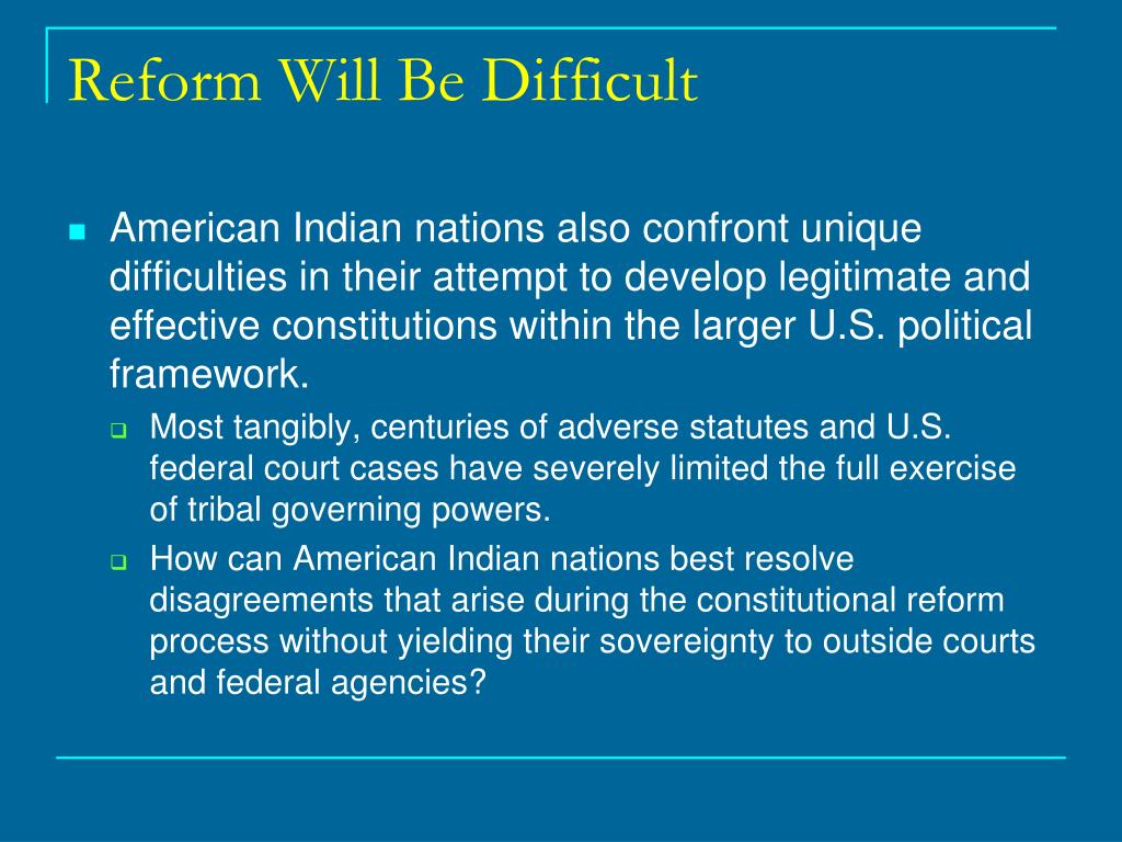 Reform Will Be Difficult • American Indian nations also confront unique difficulties in their attempt to develop legitimate and effective constitutions within the larger U.S. political framework. • Most tangibly, centuries of adverse statutes and U.S. federal court cases have severely limited the full exercise of tribal governing powers. • How can American Indian nations best resolve disagreements that arise during the constitutional reform process without yielding their sovereignty to outside courts and federal agencies?
