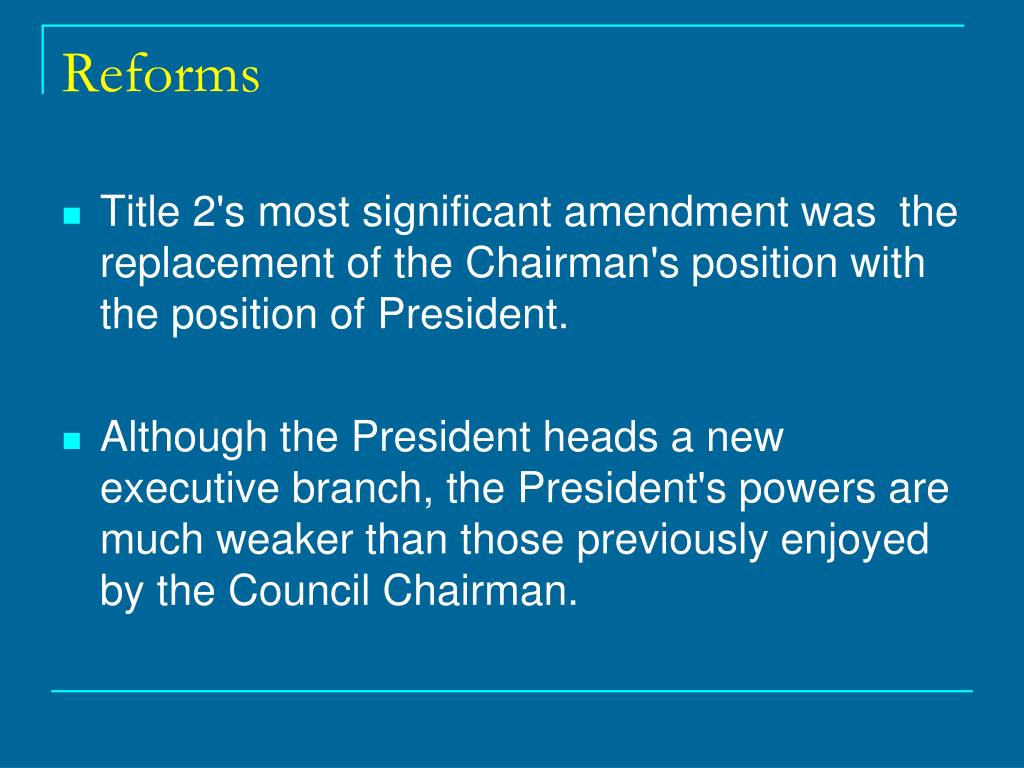 Reforms • Title 2's most significant amendment was the replacement of the Chairman's position with the position of President. • Although the President heads a new executive branch, the President's powers are much weaker than those previously enjoyed by the Council Chairman.