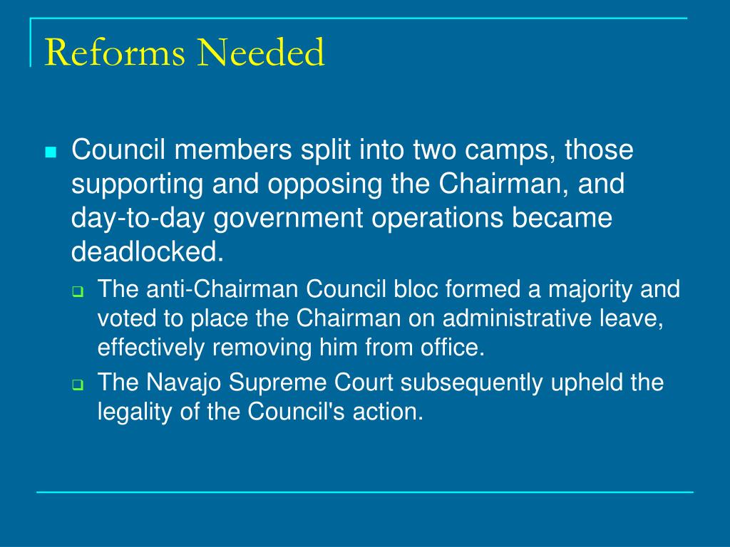 Reforms Needed • Council members split into two camps, those supporting and opposing the Chairman, and day-to-day government operations became deadlocked. • The anti-Chairman Council bloc formed a majority and voted to place the Chairman on administrative leave, effectively removing him from office. • The Navajo Supreme Court subsequently upheld the legality of the Council's action.