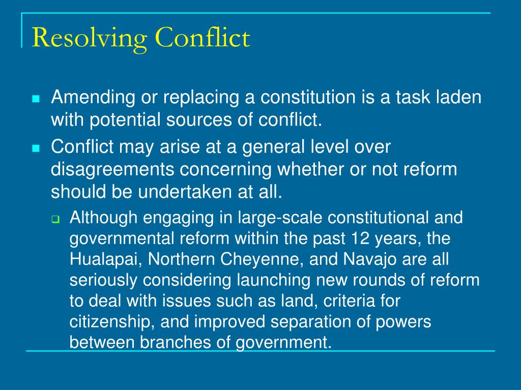 Resolving Conflict • Amending or replacing a constitution is a task laden with potential sources of conflict. • Conflict may arise at a general level over disagreements concerning whether or not reform should be undertaken at all. • Although engaging in large-scale constitutional and governmental reform within the past 12 years, the Hualapai, Northern Cheyenne, and Navajo are all seriously considering launching new rounds of reform to deal with issues such as land, criteria for citizenship, and improved separation of powers between branches of government.