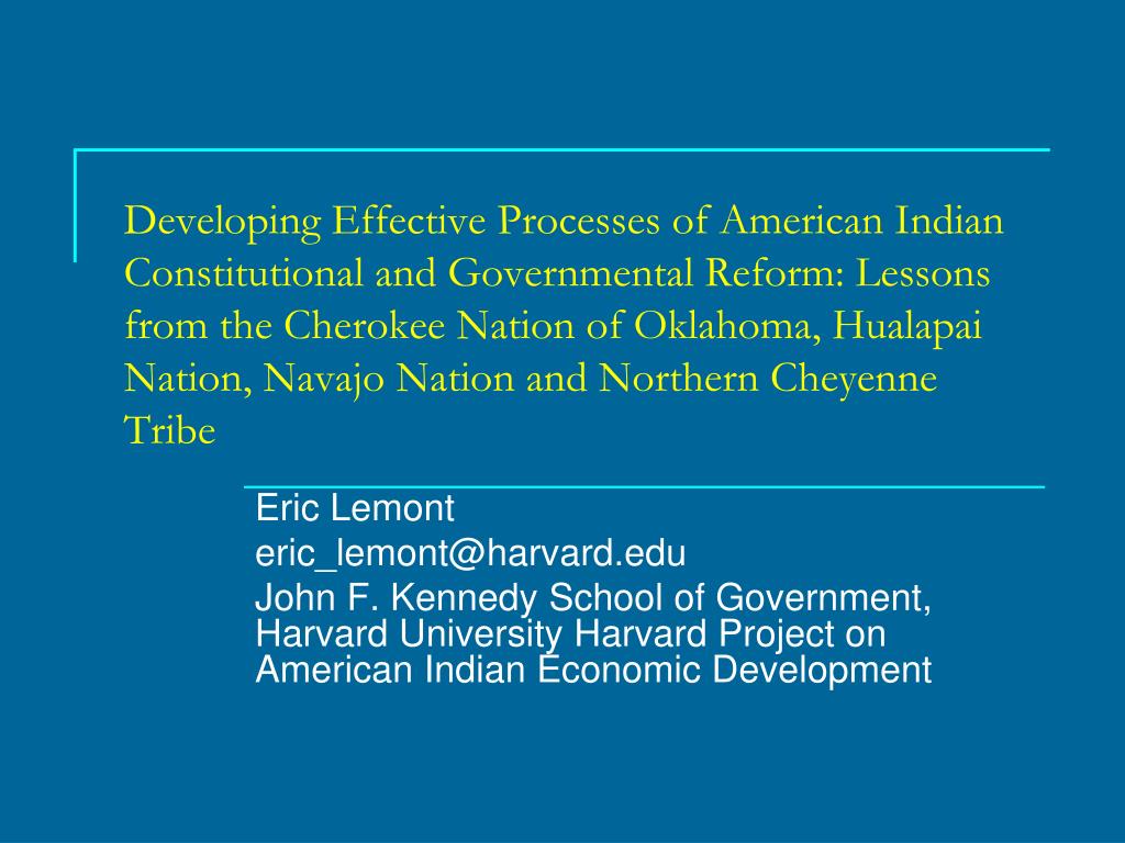 Developing Effective Processes of American Indian Constitutional and Governmental Reform: Lessons from the Cherokee Nation of Oklahoma, Hualapai Nation, Navajo Nation and Northern Cheyenne Tribe Eric Lemont eric_lemont@harvard.edu John F. Kennedy School of Government, Harvard University Harvard Project on American Indian Economic Development