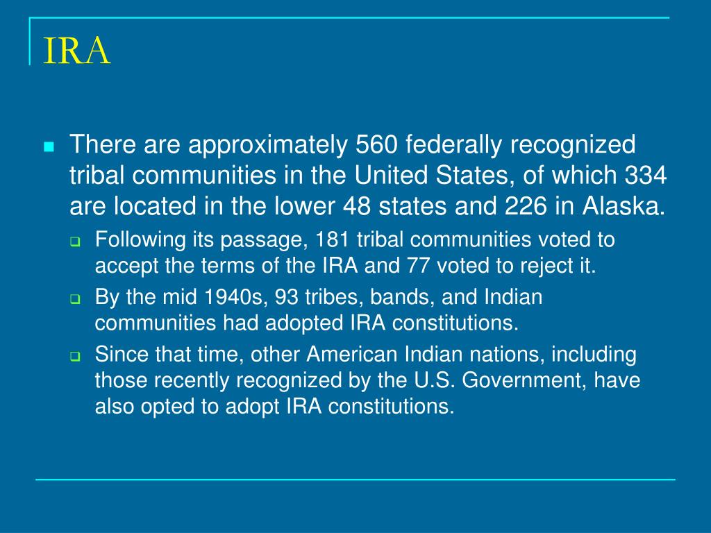 IRA • There are approximately 560 federally recognized tribal communities in the United States, of which 334 are located in the lower 48 states and 226 in Alaska. • Following its passage, 181 tribal communities voted to accept the terms of the IRA and 77 voted to reject it. • By the mid 1940s, 93 tribes, bands, and Indian communities had adopted IRA constitutions. • Since that time, other American Indian nations, including those recently recognized by the U.S. Government, have also opted to adopt IRA constitutions.