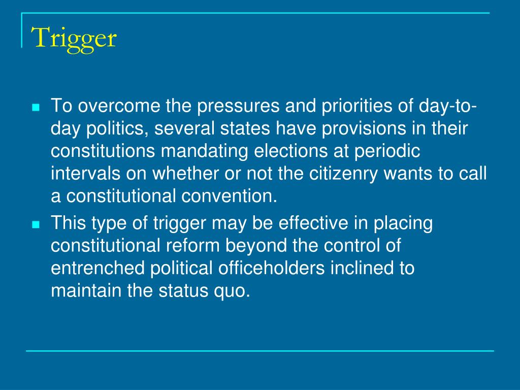Trigger • To overcome the pressures and priorities of day-to-day politics, several states have provisions in their constitutions mandating elections at periodic intervals on whether or not the citizenry wants to call a constitutional convention. • This type of trigger may be effective in placing constitutional reform beyond the control of entrenched political officeholders inclined to maintain the status quo.