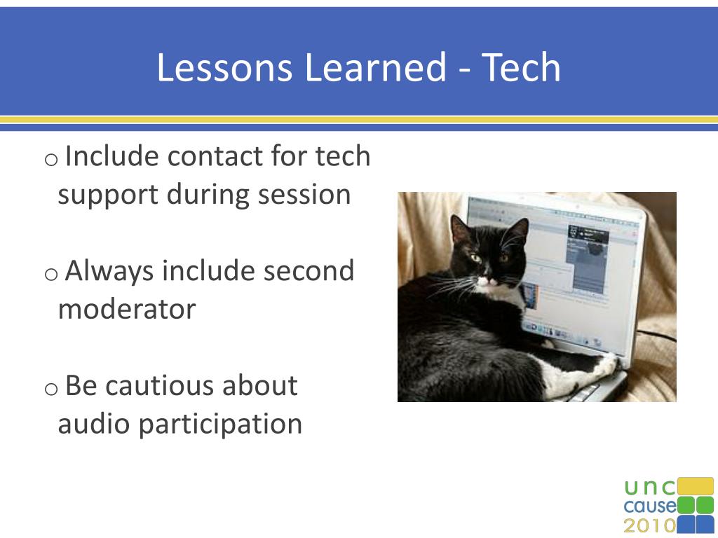 Lessons Learned - Tech • Include contact for tech support during session • Always include second moderator • Be cautious about audio participation