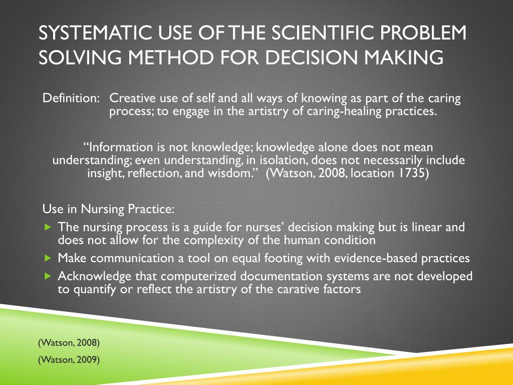 Systematic Use of the Scientific Problem Solving Method for Decision Making Definition: Creative use of self and all ways of knowing as part of the caring process; to engage in the artistry of caring-healing practices. “Information is not knowledge; knowledge alone does not mean understanding; even understanding, in isolation, does not necessarily include insight, reflection, and wisdom.” (Watson, 2008, location 1735) Use in Nursing Practice: • The nursing process is a guide for nurses’ decision making but is linear and does not allow for the complexity of the human condition • Make communication a tool on equal footing with evidence-based practices • Acknowledge that computerized documentation systems are not developed to quantify or reflect the artistry of the carative factors (Watson, 2008) (Watson, 2009)