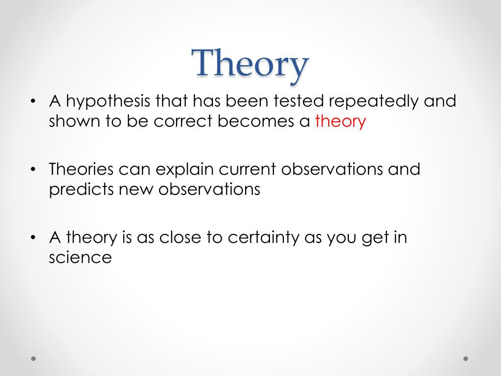 Theory • A hypothesis that has been tested repeatedly and shown to be correct becomes a theory • Theories can explain current observations and predicts new observations • A theory is as close to certainty as you get in science
