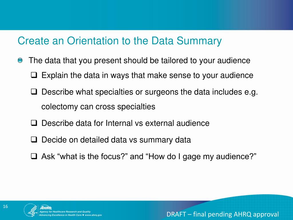 Create an Orientation to the Data Summary • The data that you present should be tailored to your audience • Explain the data in ways that make sense to your audience • Describe what specialties or surgeons the data includes e.g. colectomy can cross specialties • Describe data for Internal vs external audience • Decide on detailed data vs summary data • Ask “what is the focus?” and “How do I gage my audience?”