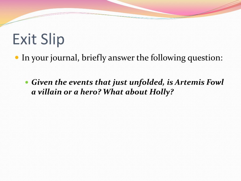 Exit Slip • In your journal, briefly answer the following question: • Given the events that just unfolded, is Artemis Fowl a villain or a hero? What about Holly?