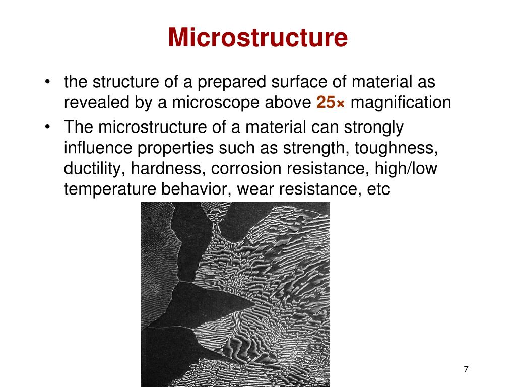 Microstructure • the structure of a prepared surface of material as revealed by a microscope above 25× magnification • The microstructure of a material can strongly influence properties such as strength, toughness, ductility, hardness, corrosion resistance, high/low temperature behavior, wear resistance, etc