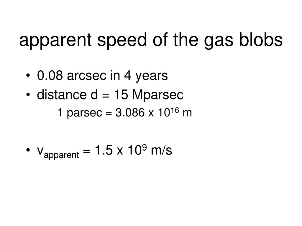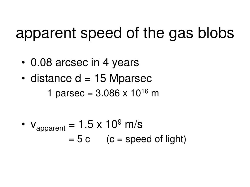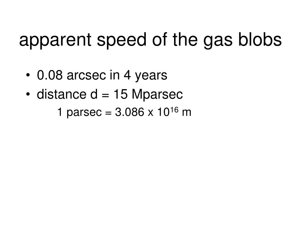 apparent speed of the gas blobs • 0.08 arcsec in 4 years • distance d = 15 Mparsec 1 parsec = 3.086 x 1016 m