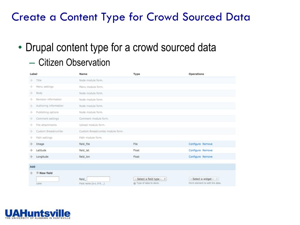 Create a Content Type for Crowd Sourced Data • Drupal content type for a crowd sourced data • Citizen Observation