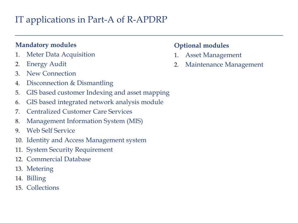 IT applications in Part-A of R-APDRP Mandatory modules • Meter Data Acquisition • Energy Audit • New Connection • Disconnection & Dismantling • GIS based customer Indexing and asset mapping • GIS based integrated network analysis module • Centralized Customer Care Services • Management Information System (MIS) • Web Self Service • Identity and Access Management system • System Security Requirement • Commercial Database • Metering • Billing • Collections Optional modules Asset Management Maintenance Management