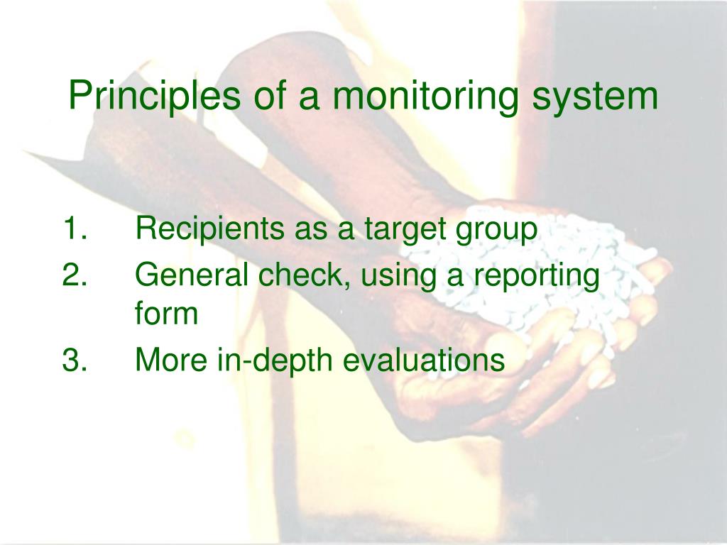 Principles of a monitoring system 1. Recipients as a target group 2. General check, using a reporting form 3. More in-depth evaluations