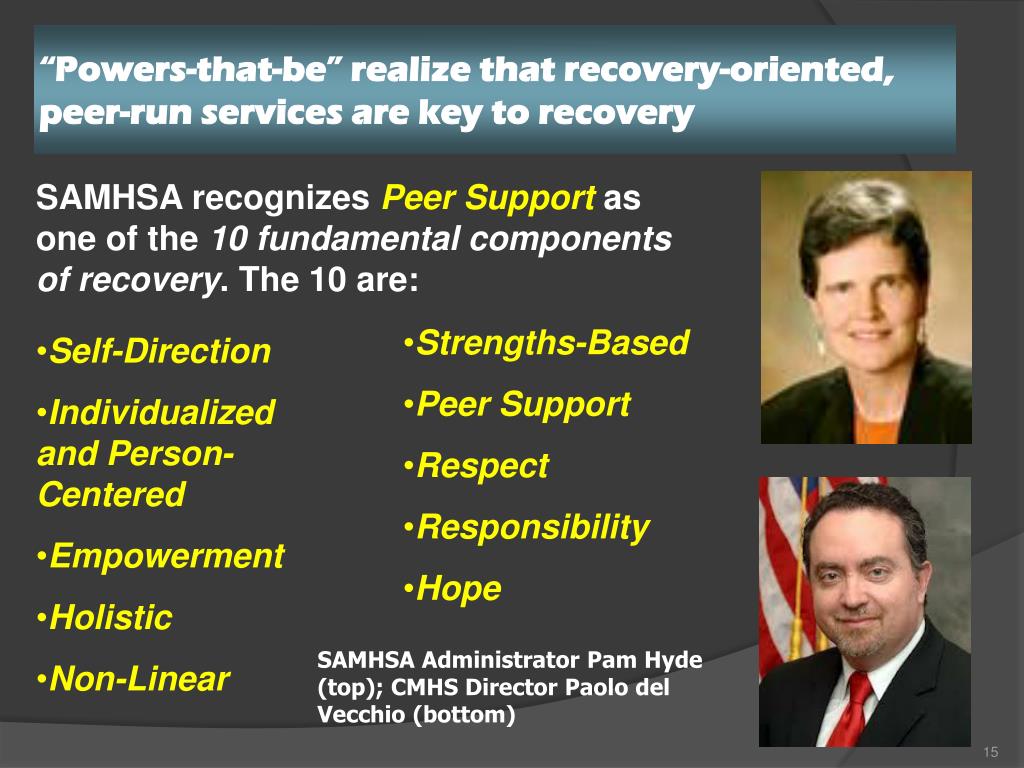 “Powers-that-be” realize that recovery-oriented, peer-run services are key to recovery SAMHSA recognizes Peer Supportas one of the 10 fundamental components of recovery. The 10 are: • Strengths-Based • Peer Support • Respect • Responsibility • Hope • Self-Direction • Individualized and Person-Centered • Empowerment • Holistic • Non-Linear SAMHSA Administrator Pam Hyde (top); CMHS Director Paolo del Vecchio(bottom)