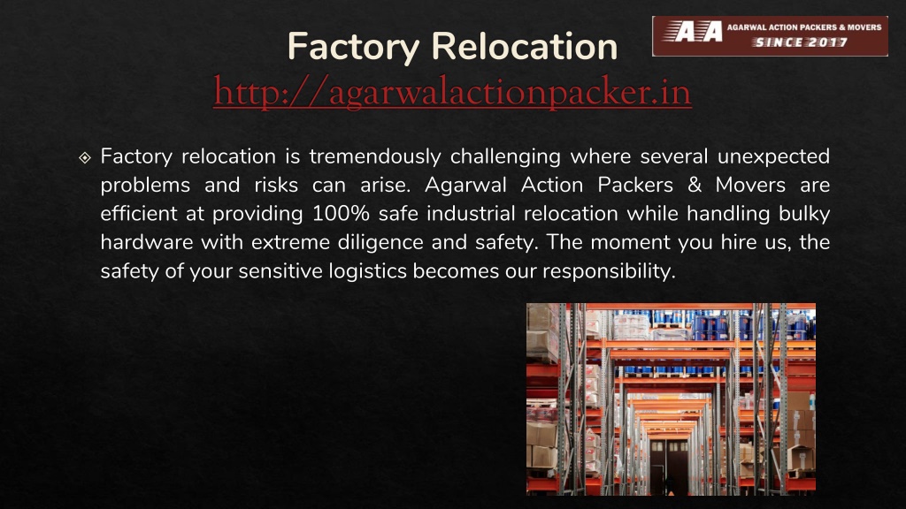 Factory Relocationhttp://agarwalactionpacker.in • Factory relocation is tremendously challenging where several unexpected problems and risks can arise. Agarwal Action Packers & Movers are efficient at providing 100% safe industrial relocation while handling bulky hardware with extreme diligence and safety. The moment you hire us, the safety of your sensitive logistics becomes our responsibility.