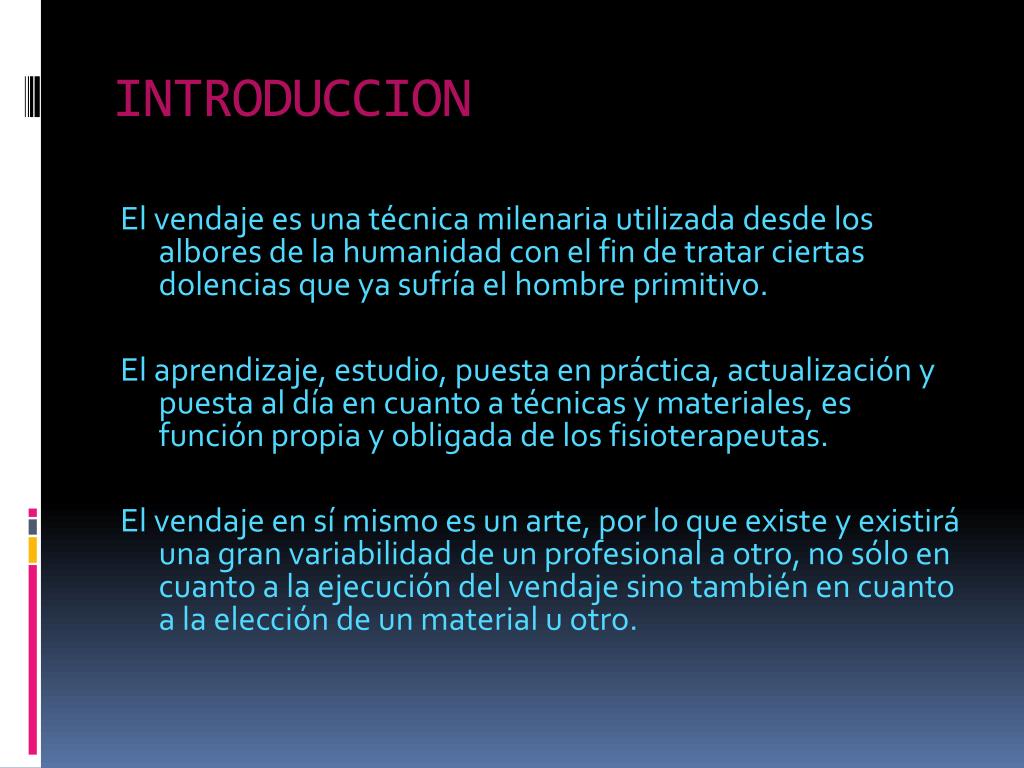 INTRODUCCION El vendaje es una técnica milenaria utilizada desde los albores de la humanidad con el fin de tratar ciertas dolencias que ya sufría el hombre primitivo. El aprendizaje, estudio, puesta en práctica, actualización y puesta al día en cuanto a técnicas y materiales, es función propia y obligada de los fisioterapeutas. El vendaje en sí mismo es un arte, por lo que existe y existirá una gran variabilidad de un profesional a otro, no sólo en cuanto a la ejecución del vendaje sino también en cuanto a la elección de un material u otro.