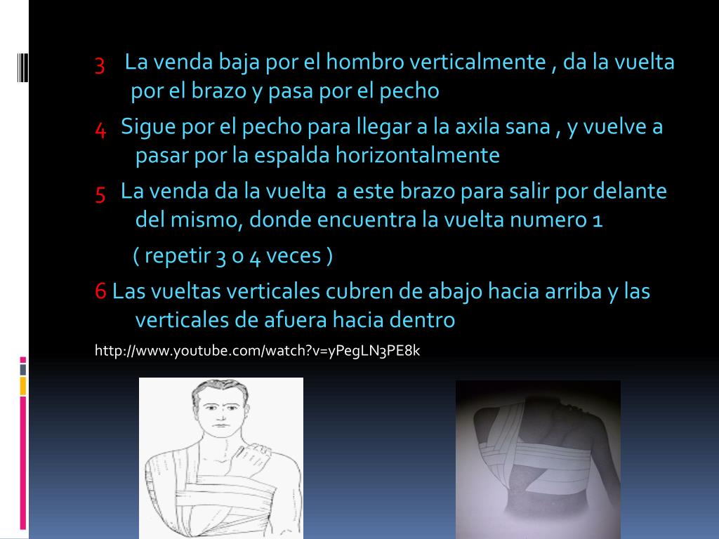 3 La venda baja por el hombro verticalmente , da la vuelta por el brazo y pasa por el pecho 4 Sigue por el pecho para llegar a la axila sana , y vuelve a pasar por la espalda horizontalmente 5 La venda da la vuelta a este brazo para salir por delante del mismo, donde encuentra la vuelta numero 1 ( repetir 3 o 4 veces ) 6 Las vueltas verticales cubren de abajo hacia arriba y las verticales de afuera hacia dentro http://www.youtube.com/watch?v=yPegLN3PE8k