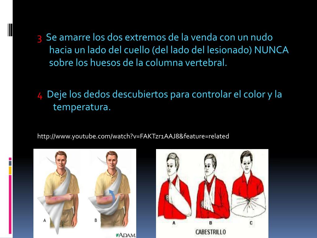 3 Se amarre los dos extremos de la venda con un nudo hacia un lado del cuello (del lado del lesionado) NUNCA sobre los huesos de la columna vertebral. 4 Deje los dedos descubiertos para controlar el color y la temperatura. http://www.youtube.com/watch?v=FAKTzr1AAJ8&feature=related