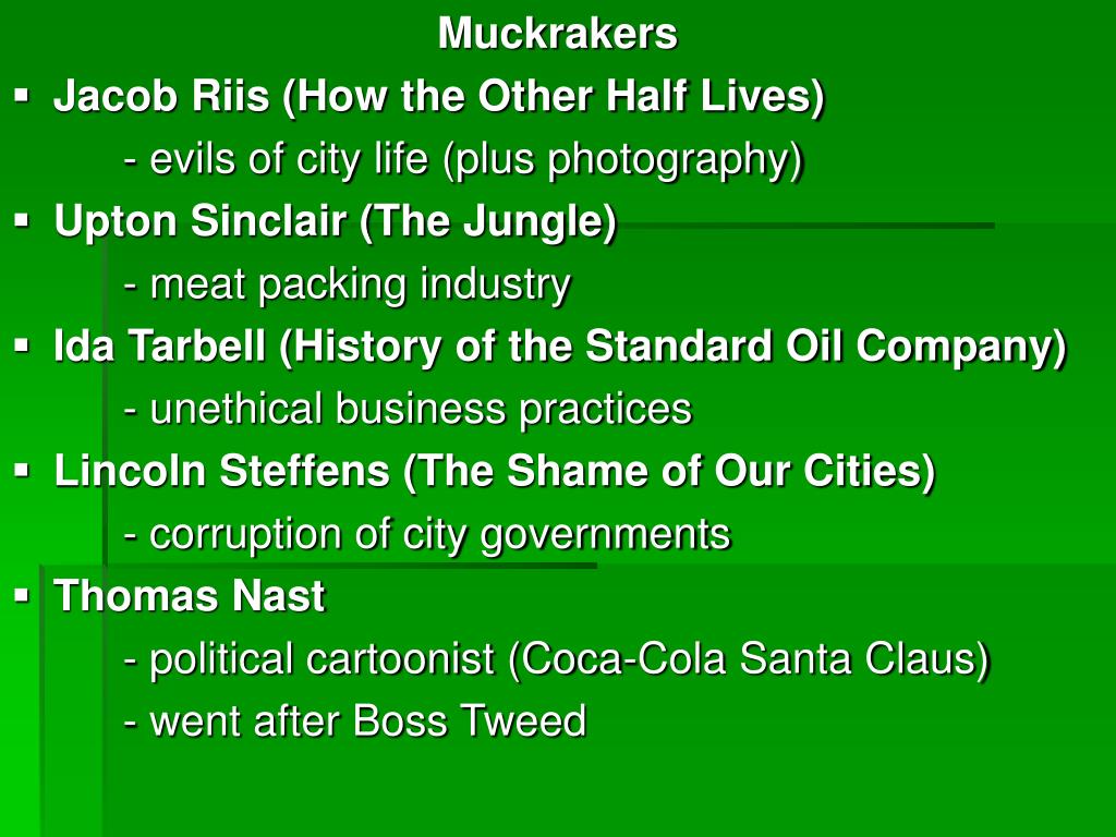 Muckrakers • Jacob Riis (How the Other Half Lives) - evils of city life (plus photography) • Upton Sinclair (The Jungle) - meat packing industry • Ida Tarbell (History of the Standard Oil Company) - unethical business practices • Lincoln Steffens (The Shame of Our Cities) - corruption of city governments • Thomas Nast - political cartoonist (Coca-Cola Santa Claus) - went after Boss Tweed
