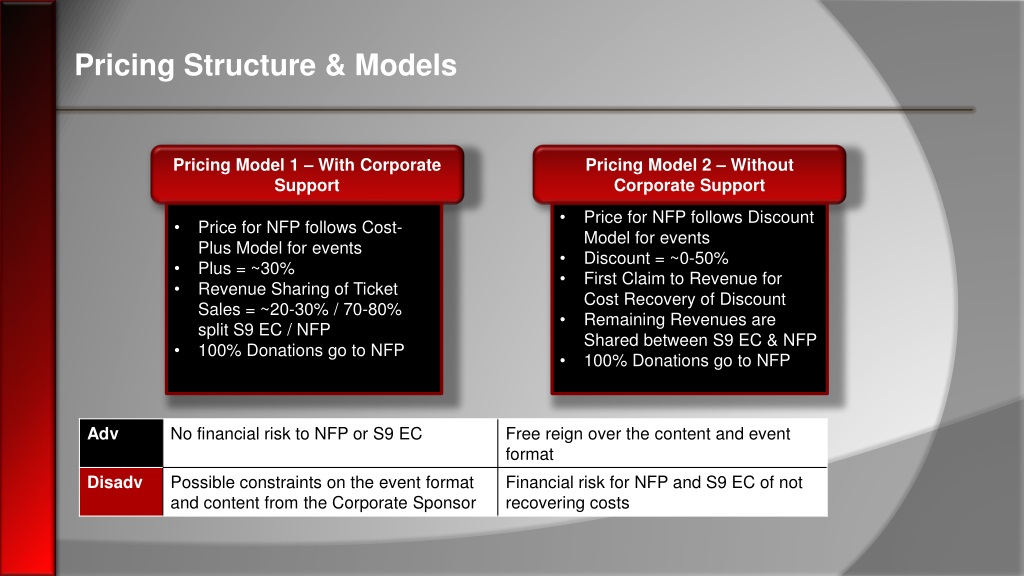 Pricing Structure & Models Pricing Model 1 – With Corporate Support Pricing Model 2 – Without Corporate Support • Price for NFP follows Cost-Plus Model for events • Plus = ~30% • Revenue Sharing of Ticket Sales = ~20-30% / 70-80% split S9 EC / NFP • 100% Donations go to NFP • Price for NFP follows Discount Model for events • Discount = ~0-50% • First Claim to Revenue for Cost Recovery of Discount • Remaining Revenues are Shared between S9 EC & NFP • 100% Donations go to NFP