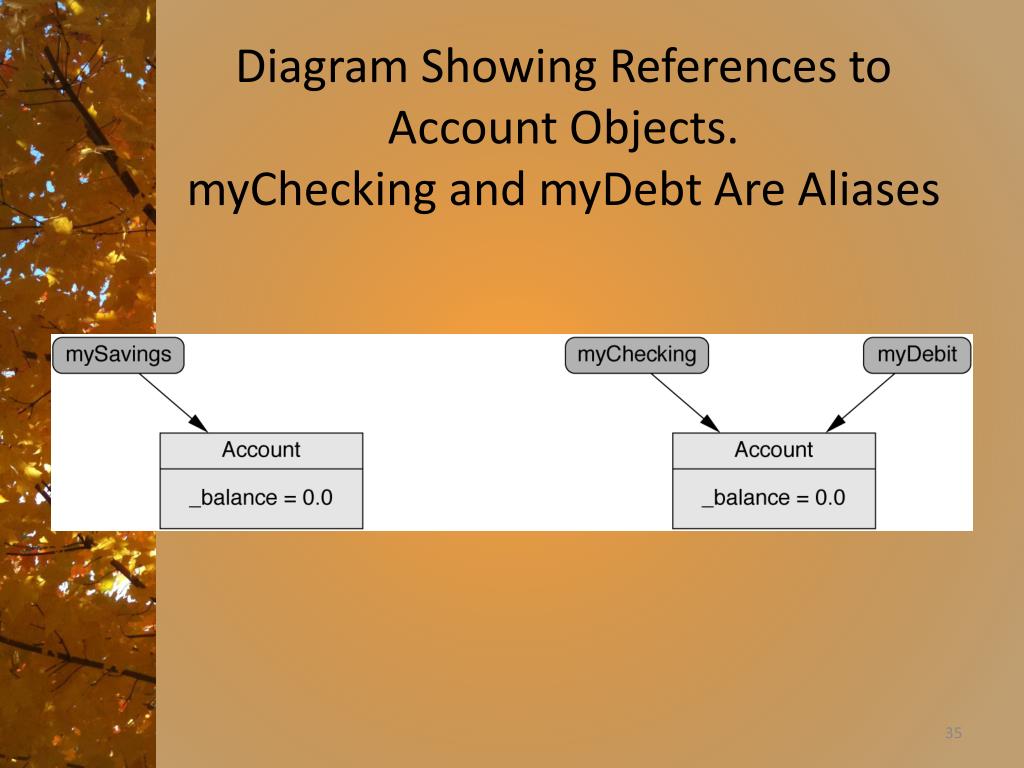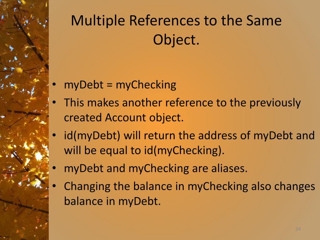 Multiple References to the Same Object. • myDebt = myChecking • This makes another reference to the previously created Account object. • id(myDebt) will return the address of myDebt and will be equal to id(myChecking). • myDebt and myChecking are aliases. • Changing the balance in myChecking also changes balance in myDebt.