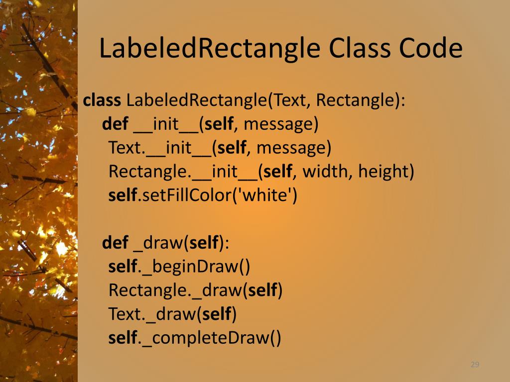 LabeledRectangle Class Code classLabeledRectangle(Text, Rectangle): def __init__(self, message) Text.__init__(self, message) Rectangle.__init__(self, width, height) self.setFillColor('white') def _draw(self): self._beginDraw() Rectangle._draw(self) Text._draw(self) self._completeDraw()