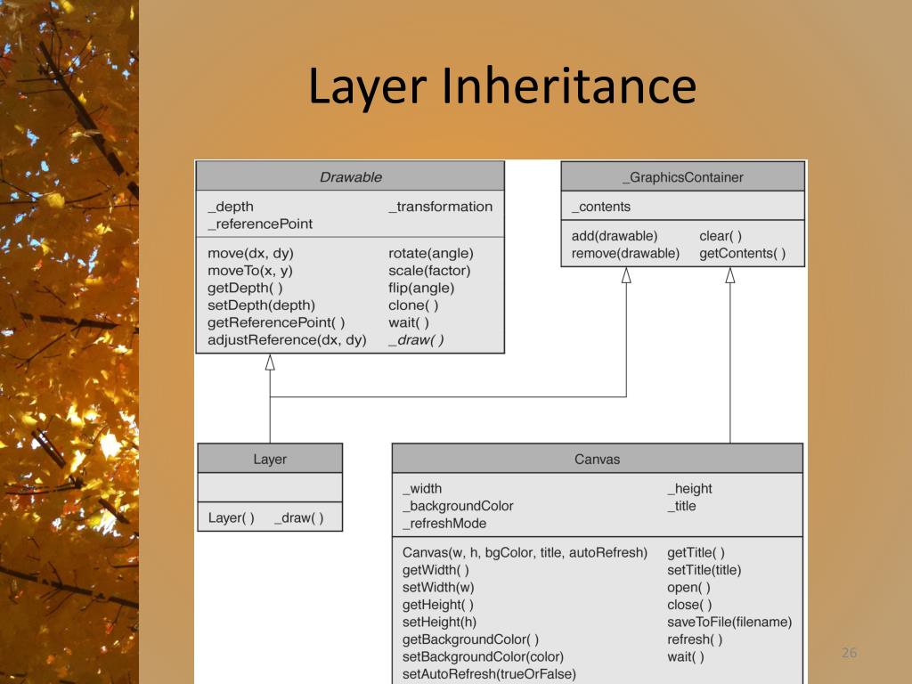 Layer Class Code class Layer(Drawable, _GraphicsContainer): def __init__(self): Drawable.__init__(self): #initialize both base _GraphicsContainer.__init__(self) #classes def __draw(self): self._beginDraw() for shape in self.getContents(): shape._draw() self._completeDraw()