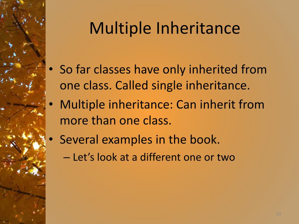 Multiple Inheritance • So far classes have only inherited from one class. Called single inheritance. • Multiple inheritance: Can inherit from more than one class. • Several examples in the book. • Let’s look at a different one or two